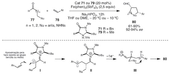 Cátions radicalares sao intermediários reativos, capazes de participar da formaçao de ligaçoes C-C, C-O, C-N, C-S e C-X. Sendo assim, uma vez que estes intermediários SOMO-ativados sao formados, diferentes reaçoes podem ser promovidas, tornando este modo de ativaçao bastante atrativo. Uma série de reaçoes enantiosseletivas ativadas via SOMO foram relatadas nos últimos anos, tais como reaçoes de alilaçao, alquilaçao, enolizaçao, arilaçao, carbo-oxidaçao, vinilaçao, alquinilaçao de aldeídos, halogenaçao, ciclizaçao de polienos.72,73 As reaçoes de cicloadiçao (4+2) e (3+2) apresentadas por MacMillan e colaboradores ilustram o grande potencial deste modo de ativaçao. A partir de compostos simples e baratos como aldeídos aromáticos ou β-aminoaldeídos 77 e olefinas conjugadas 78, na presença de imidazolidinona e oxidante, produtos cíclicos funcionalizados com alto valor agregado sao formados com excelente eficiência química, regiosseletividade e estereosseletividade (Esquema 20, superior).74,75 A enamina inicialmente formada a partir da reaçao do organocatalisador 71 ou 79 e o aldeído 77 perde um elétron na presença do oxidante de ferro, formando o cátion radicalar I que reage estereosseletivamente com a olefina conjugada pela face oposta ao grupo R (metila ou benzila) da porçao imidazolidonona, levando ao intermediário II, que é novamente oxidado e forma o carbocátion III que sofre ciclizaçao intramolecular fornecendo o produto (Esquema 20, inferior).
