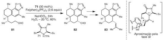 Recentemente, Li e colaboradores empregaram a reaçao enantiosseletiva de α-arilaçao de aldeído organocatalisada via SOMO como etapa-chave na síntese total do diterpeno Pseudopteroxazol (83).76 O aldeído 81 foi submetido à reaçao de α-arilaçao nas condiçoes de MacMillan77 fornecendo o tetraciclo 82 em 60% de rendimento como um único diastereoisômero (Esquema 21).