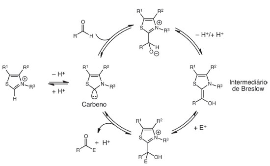 O intermediário ativado nas diferentes reaçoes organocatalisadas pelos NHCs resulta de um ataque nucleofílico do carbeno à aldeídos. De acordo com o mecanismo proposto por Breslow em 1958, após este ataque nucleofílico, seguido por etapas de desprotonaçao e reprotonaçao, é formado um intermediário enaminol, conhecido como intermediário de Breslow (Esquema 26).96,100 Esse intermediário reage diretamente com eletrófilos, entretanto, dependendo da natureza dos substituintes do aldeído, ele também pode reagir com nucleófilos ou participar de reaçoes pericíclicas. Essa versatilidade vem promovendo desde reaçoes enantiosseletivas de inversao de polaridade, conhecidas também como reaçoes umpolung, tais como condensaçao de benzoína e reaçoes de Stetter, até reaçoes enantiosseletivas de cicloadiçao, principais exemplos nas publicaçoes mais recentes.98,101-104