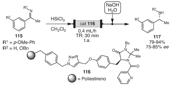 Esquema 32. Reduçao de iminas em condiçao de fluxo contínuo organocatalisada com picolilimidazolidinonas imobilizadas em poliestireno