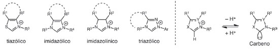 Como consequência da expansao das aplicaçoes de NHCs nos últimos 15 anos, tanto na catálise por metais de transiçao, quanto na organocatálise, diferentes tipos de carbenos vêm sendo sintetizados, com destaque aos heterociclos tiazólicos, imidazólicos, imidazolínicos e triazólicos contendo grupos substituintes quirais em suas estruturas (Figura 7). Na maioria das reaçoes, o carbeno é gerado in situ a partir da desprotonaçao do sal correspondente. Esses sais sao bastante estáveis e possuem valores de pKa na faixa de 16 a 24 (em H2O).97