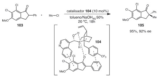 O primeiro relato de alquilaçao enantiosseletiva utilizando catalisador de transferência de fase foi feito em 1984 por Dolling e colaboradores.112,113 Neste trabalho, a alquilaçao da indanona 103 foi realizada na presença do sal de amônio quaternário 104, derivado da cinchona. A eficiência e alta enantiosseletividade foram atribuídas à formaçao de um par iônico intermediário envolvendo ligaçoes de hidrogênio e interaçoes eletrostáticas e π-stacking, entre o catalisador 104 e o enolato formado a partir de 103, de modo que apenas a face da frente do ânion fica exposta ao agente alquilante (Esquema 29).