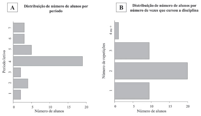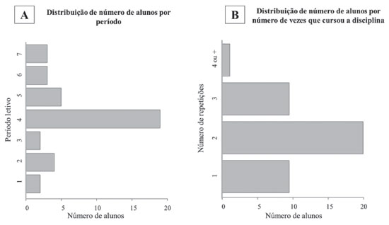 Figura 1. Dados sobre as retençoes em Química geral. A) caracterizaçao dos períodos dos acadêmicos; B) Quantidade de retençoes por aluno