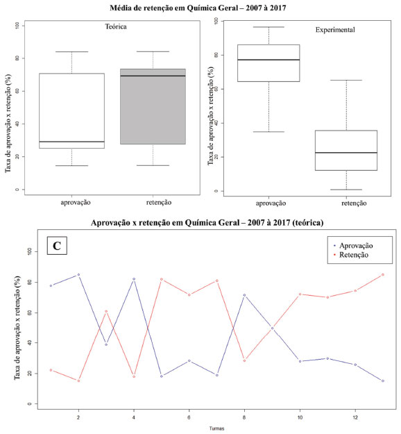 O modelo gráfico de caixa ou boxplot é uma ferramenta estatística utilizada para avaliar a distribuiçao empírica dos dados identificando nesse trabalho a relaçao entre a média das retençoes priorizando a faixa comum e excluindo as variáveis independentes. Por meio dessa ferramenta pôde-se revelar os percentuais médios significativos no processo (Figura 2A e 2B). Verificou-se que nos 10 anos de existência do campus, a média de retençao Química Geral experimental foi de 26,46% e mediana de 22,64%. Em Química Geral teórica a média foi de 56,25% e mediana de 70,18%. Na Figura 2B é possível visualizar o quanto o índice de retençao foi superior ao de aprovaçao nas turmas em que essa disciplina foi ofertada. Em apenas 31% das ofertas o índice de aprovaçao foi superior ao de retençao e, analisando as quatro últimas ofertas, observa-se um aumento gradativo desse índice. Segundo a Lei de Diretrizes e Bases (LDB 9394), os tipos de retençao podem ser divididos em 3 grupos: reprovaçao por nota, reprovaçao por falta e trancamento. Os dados institucionais a respeito do índice de aprovaçao e retençao em Química Geral no período de 2007 a 2017 podem ser visualizados na Figura 3. Ao se observarem as informaçoes contidas na tabela, evidencia-se que o problema está associado ao baixo rendimento dos alunos nas atividades avaliativas da disciplina em comparaçao com a frequência dos alunos, visto que o índice de retençao por nota é predominante ao de reprovaçao por frequência.