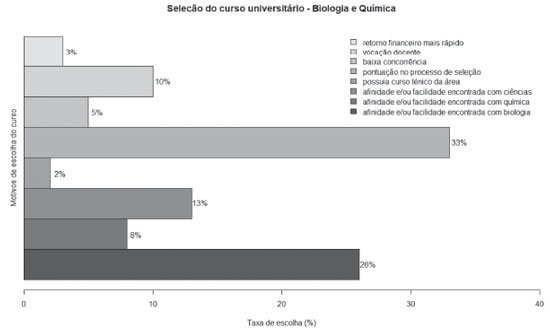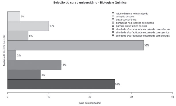 Afinidade com a disciplina Na turma analisada verificou-se que como o curso é de ciências, há disciplinas da área de biologia e de química. Alguns discentes afirmaram que já haviam completado as disciplinas da área de biologia e alguns até defendido o trabalho final de curso, no entanto, nao haviam prosseguido no viés químico devido à retençao em Química Geral. Na avaliaçao, 79% dos discentes afirmaram que se pudessem separar a habilitaçao do curso, optariam por selecionar apenas uma área de concentraçao. Esse percentual é complementado pela questao seguinte, em que ao serem questionados sobre quais das duas áreas eles se identificaram mais, a maior parte dos estudantes analisados (63%) afirmaram que se identificam mais com Biologia, seguido de 19% que se identificavam com Química e 18% com ambas. Além do que, afirmam que a retençao em Química Geral teórica diminui a preferência pela área de concentraçao em química, seja total ou parcialmente. A fim de apresentar, em linhas gerais, os critérios e motivos para a escolha do curso, considerou-se a Figura 4 como forma de nortear a análise dessa pesquisa.