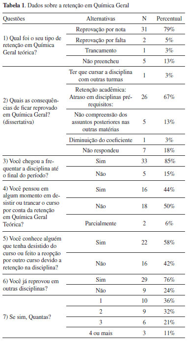 METODOLOGIA Este trabalho parte de uma metodologia integrante entre uma pesquisa bibliográfica e uma pesquisa de campo. A pesquisa adotou abordagem qualitativa e quantitativa com caraterísticas de estudo descritivo e caráter exploratório buscando correlaçoes e explicaçoes para a problemática da alta retençao na disciplina de Química Geral. A primeira etapa consistiu na revisao bibliográfica e busca de teorias para fundamentaçao do estudo incluindo o levantamento de dados a partir do sistema acadêmico com intuito de embasar o estudo de campo. Buscou-se descobrir a existência de relaçoes entre a retençao em Química Geral e as variáveis baseadas no Modelo Conceitual de Desgaste de Estudante nao tradicionais de Bean e Metzner10 associadas aos seguintes critérios: 1) desempenho acadêmico; 2) variáveis acadêmicas; 3) experiência e objetivos educacionais e 4) variáveis ambientais. Novos itens foram incluídos tendo em vista o interesse de enriquecer as associaçoes, como a afinidade com a disciplina e a perspectiva de intervençao relacionada ao discente, ao docente e à instituiçao. Os dados utilizados na pesquisa de campo foram obtidos por meio de questionários aplicados aos acadêmicos, caracterizando o trabalho como um estudo de caso. A amostragem participante foi composta por estudantes do Instituto de Saúde e Biotecnologia da Universidade Federal do Amazonas (ISB-UFAM), no município de Coari, Amazonas, Brasil. O critério adotado para seleçao dos alunos foi a retençao na disciplina de Química Geral teórica. Para tanto, foram convidados a participar os discentes de uma turma extra do curso de Ciências: Biologia e Química formada por 38 indivíduos que após assinarem o termo de consentimento livre e esclarecido receberam o questionário contendo 27 perguntas abertas e fechadas. A terceira etapa do percurso metodológico constituiu-se da coleta de dados da instituiçao (dados secundários) relativos à situaçao acadêmica dos alunos relacionados ao percentual de aprovaçao e retençao, além da natureza deste último. A retençao foi calculada baseando-se na resoluçao vigente, considerando em retençao os estudantes que reprovaram por falta, trancamento ou nota inferior à média 5,0 e considerou o período de 2007 à 2017. Os dados obtidos foram tabulados e analisados quantitativamente de modo a apresentá-los sob a forma de percentual e de número absoluto. A análise de dados deu-se por meio da proporçao entre o número de indivíduos que forneceram cada resposta e o total de pessoas que responderam à pergunta. Além disso, também se pôde aplicar, sobre o material coletado, uma análise qualitativa das dificuldades. Os dados obtidos foram submetidos à análise estatística calculando a média, moda e mediana utilizando o programa de estatística R 2.14.0® para Windows.