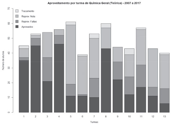 Dados sobre a retençao Ao ser analisado a quantidade de reprovaçoes em Química Geral, verificou-se uma correlaçao com a periodizaçao, em que quanto maior o período, mais reprovaçoes eram verificadas na amostra entrevistada. Um maior percentual foi detectado em alunos que estavam repetindo a disciplina pela terceira vez (Figura 1B). Entre as disciplinas Química Geral teórica e Química Geral experimental, verificou-se uma discrepância entre os valores de aprovaçao. Enquanto no universo analisado apenas 3 pessoas afirmaram que ficaram retidos na disciplina experimental, 89% dos discentes já ficaram retidos pelo mais de uma vez na disciplina teórica e 26% reprovaram mais de 2 vezes. Esses dados podem ser subsidiados pelos dados obtidos sobre índices de reprovaçao/aprovaçao nessas disciplinas nos anos anteriores, conforme a Figura 2.