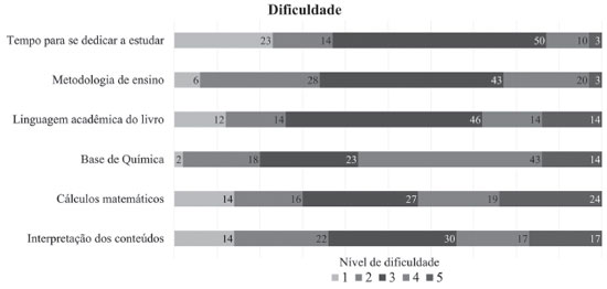 Os dados encontrados sao condizentes com as questoes anteriores no que diz respeito a preferência das disciplinas do eixo em biologia. Outro ponto relevante dar-se-á pelo fato do maior percentual dos discentes terem selecionado esse curso pela nota acessível no processo de seleçao. Os estudantes revelam que encontram nas licenciaturas uma forma de ingresso com baixa concorrência no ensino superior. Atualmente a entrada dos discentes nas universidades federais é principalmente através do Exame Nacional do Ensino Médio (ENEM). Nesse processo, os estudantes fazem uma prova de conhecimentos gerais e somente após a computaçao das notas é realizada a seleçao do curso. Esse é um assunto abordado por muitos trabalhos científicos em que em alguns casos os discentes optam pelo curso em que possuem pontuaçao para entrar e nao necessariamente nos que tem afinidade ou que sonharam cursar. Verificou-se que apenas 10% dos discentes afirmaram que selecionaram o curso pela "vocaçao docente". As discussoes que permeiam esse tema sao retratadas de maneira diversa e nos mais variados contextos, sendo uma temática importante que visa auxiliar na compreensao da complexidade que envolve a escolha docente como profissao. A vocaçao profissional é a tendência ou habilidade natural construída pelo indivíduo para exercer uma profissao. No entanto, as pesquisas no campo de educaçao têm demonstrado que a atuaçao nao se restringe apenas na vocaçao e nem ao domínio de um conjunto de técnicas aprendidas no curso de formaçao, sendo um emaranhado complexo de variáveis.13-15 Dessa forma, o indivíduo que nao consegue reconhecer-se pertencente a esse grupo, tende a distanciar-se, ocasionando frequentemente conflitos ao reconhecerem que o curso que optam nao corresponde às expectativas profissionais almejadas.2,4 Metodologia de estudo Um outro ponto que merece ser analisado é relacionado à metodologia de estudo dos discentes. O ingresso a um curso universitário, seja por meio de um vestibular ou do ENEM, nao garante que os mesmos apresentem maturidade para estudar. Autores descrevem que há um grande impacto na forma como os discentes encaravam a metodologia de estudo no Ensino Médio, em que conseguiam na véspera abranger todo o conteúdo da prova, para a situaçao na universidade, em que há uma maior quantidade de assuntos e que precisa ser estudado com antecedência. A educaçao no Ensino Básico (Fundamental e Médio) difere-se consideravelmente da realidade de um ensino superior, variando desde a didática até a formataçao dos trabalhos exigidos nos mesmos. Ao ingressarem num curso superior, frequentemente o aluno revela um despreparo para o planejamento dos estudos das disciplinas e se depara com diversos campos de atuaçao que o levará a amadurecer para a sua nova realidade.16 Como a disciplina Química Geral é ofertada comumente nos períodos iniciais, percebe-se uma falta de amadurecimento universitário oriundo dos discentes por nao saberem a metodologia de como estudar. Nesse sentido, estudos internacionais confirmam os dados encontrados neste trabalho ao relatarem que muitos alunos se chocam ao ingressarem na universidade devido às abordagens pedagógicas serem distintas das do Ensino Médio, por vezes inadequadas ao perfil desse aluno, e à integraçao de novas informaçoes e conhecimentos.6 A questao 8 (Tabela 1) constata dados preocupantes sobre os acadêmicos em relaçao a quantidade de horas semanais que eles se dedicam para estudar. Verificou-se que mais que 76% dos discentes afirmam que utilizam menos que 35 minutos diários para essa finalidade e somente 5% afirmam que estudam mais que 7 horas semanais, o que equivale a cerca de 1 hora diária. 19% estudam entre 5 e 6 horas e o maior percentual (46%) dos estudantes afirmam que disponibilizam 3-4 horas para rever os conteúdos e realizar exercícios, seguidos de 30% que reconhecem que estudam somente de 1 ou 2 horas semanais Segundo alguns autores, essa disciplina confronta os alunos com muito conteúdo e pouco tempo para assimilar o que é ministrado.17,18 E o tempo descrito pelos discentes nessa pesquisa torna-se insuficiente para que ocorra um maior aproveitamento da disciplina. Faz-se necessário um tempo maior para que ocorra o amadurecimento do estudante e entao ele comece a encarar os problemas de frente. Para Pastoriza et al.,3 muitos alunos só assistem aula e vao estudar na semana de prova e somente depois da avaliaçao descobrem que nao estudaram o suficiente. Os dados encontrados nesse trabalho sao condizentes com o artigo de Jesus et al.,4 no qual os autores descrevem que a maioria dos discentes dedicam apenas 2 h semanais aos seus estudos individuais fora da sala de aula. Nesse artigo os autores alertam para o fato de a distribuiçao dessas horas semanais ainda estarem divididas entre as disciplinas do período, em que com um número médio de cinco disciplinas, 2 h semanais passa a ser um tempo extremamente pequeno para a capacidade do aprendizado, explicando assim as notas baixas obtidas na disciplina. No que se refere ao material didático que os alunos costumam estudar, os índices norteiam que 38% baseiam-se em vídeo aulas ou sites da internet, seguidos de 31% que estudam pelo livro indicado pelo docente como referência bibliográfica ou livros complementares, 22% utilizam as anotaçoes das aulas e apenas 9% buscam artigos científicos. Perfil socioeconômico Analisando o perfil socioeconômico dos discentes, examinou-se que 84% nao trabalham. Ao serem questionados sobre a moradia, 68% moram com os pais, 11% com o cônjuge e 8% moram sozinhos. Os demais percentuais dividem-se entre outros familiares ou amigos. Cerca de 35% dos discentes recebem alguma bolsa ou auxílio promovido pela Universidade, sendo 79% originada de auxílio acadêmico, 14% de auxílio moradia e 7% de bolsa trabalho. Segundo uma das descriçoes, "ter que me sustentar, pagar aluguel e estudar é difícil. Estudar e saber que 