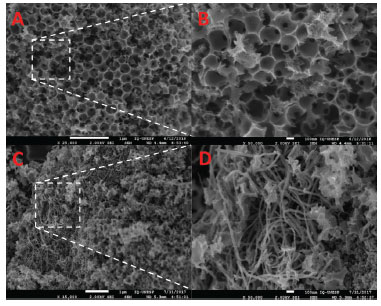 ![]() Figura 1. Imágenes SEM (A) HPC400, (B) HPC400 con aumento, (C) Ag2S/HPC400, (D) Ag2S/HPC400 con aumento