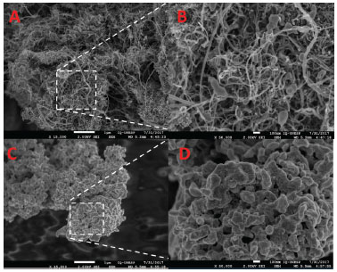![]() Figura 2. Imágenes SEM (A) Ag2S/MWCNT, (B) Ag2S/MWCNT con aumento, (C) Np-Ag2S, (D) Np-Ag2S con aumento