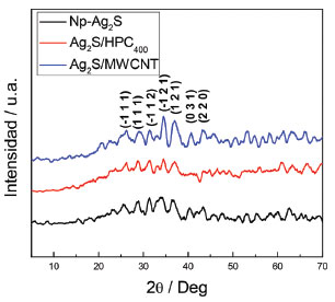 La Figura 3 muestra el difractograma de las Np-Ag2S, Ag2S/HPC400 y Ag2S/MWCNT sintetizadas por el método coprecipitación, los picos formados coincidieron con las características de los cristales de Ag2S indicando una estructura monoclínica.21,22