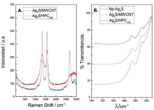 La Figura 4A muestra los espectros Raman de los sensores Ag2S/MWCNT, Ag2S/HPC400 y las Np-Ag2S sin soportar. Estos espectros presentan bandas intensas en 1300 y 1600 cm-1, correspondiente a las bandas D y G, además presenta dos bandas adicionales menos intensas a 2650 cm-1, denominada G' y a 2900 cm-1 siendo estas características de los materiales carbonosos empleados en el soporte.23 La vibración del enlace Ag-S no se puede apreciar debido a que su señal es solapada con la banda G en 1300 cm-1 correspondiente al carbón. Para complementar el análisis, se analizó las muestras empleando espectroscopía IR. La Figura 4B muestra el espectro IR para los materiales obtenidos, se observa una banda débil en el rango 500 – 600 cm-1 del Ag-S.24
