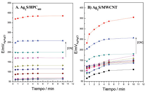 En las voltamperometrías cíclicas para los sensores Ag2S/HPC400 y Ag2S/MWCNT usando como electrolito soporte KOH 0.1 mol L-1 mostradas en las Figuras 1S. A y B, se observan un pico de oxidación de Ag0 a Ag(I) a 0.31 V y un pico de reducción a 0.05 V, la corriente asociada al pico de reducción25, en el sensor Ag2S/MWCNT, es mucho mayor que en el sensor Ag2S/HPC400 pudiendo estar relacionado a la mayor área superficial del material conformado con MWCNT accesible por difusión iónica. Estudio de estabilidad Se realizó la prueba de estabilidad de los sensores Ag2S/HPC400 y Ag2S/MWCNT, para el cual se determinó el tiempo necesario para establecer el equilibrio de reacción entre las Np-Ag2S con el ion cianuro, medido a diferentes concentraciones de cianuro libre (1×10-8 - 1×10-2 mol L-1)[CN-]. La Figura 5 A presenta los resultados obtenidos con el sensor Ag2S/HPC400 el cualestablece el potencial de equilibrio en menos de 1 minuto, el valor de potencial es constante y aumenta con el incremento de concentración del ion cianuro restableciendo el equilibrio en menos de 3 minutos, mientras que el sensor Ag2S/MWCNT (Figura 5 B) alcanza el potencial de equilibrio aproximadamente a los 5 minutos, todas las medidas se realizaron por triplicado. El mayor tiempo empleado para alcanzar el potencial de equilibrio parece estar relacionado al mayor tiempo empleado en la difusión del ion cianuro al interior del electrodo conformado con MWCNT, en el caso del sensor Ag2S/HPC400, el menor tiempo para establecer el potencial de equilibrio puede atribuirse a una dispersión más homogénea de las Np-Ag2S sobre la superficie porosa del HPC y al rápido acceso al interior de los poros del HPC confiriéndole una mejor estabilidad.