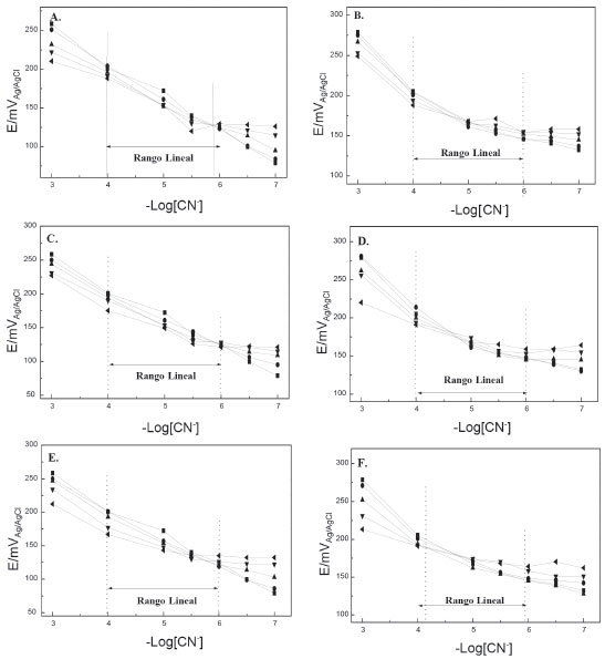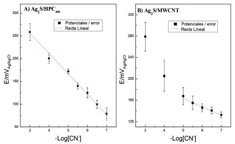 ![]() Figura 6. Curvas de calibración para la detección de cianuro libre en un rango de concentraciones de 1×10-7 - 1×10-3 mol L-1 para (A) Ag2S/HPC400 y 1×10-5 -1×10-7 mol L-1 para (B) Ag2S/MWCNT. En KOH 0.1 mol L-1