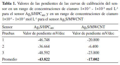 Prueba de reproducibilidad y linealidad de los sensores Ag2S/ HPC400 y Ag2S/MWCNT La prueba de reproducibilidad se realizó por triplicado con el objetivo de obtener un promedio de las pendientes de los sensores Ag2S/HPC400 y Ag2S/MWCNT. En la Figura 6 se observa la curva de calibración obtenida del promedio de las tres pruebas realizadas. En la Tabla 1 se puede observar que el sensor Ag2S/HPC400 presenta valores de pendiente similares para cada una de las pruebas realizadas, con un valor promedio de pendiente de -43.82 mV/dec; el mismo comportamiento se observó para el sensor Ag2S/MWCNT, sin embargo, su valor de pendiente es menor (-17.002 mV/dec) al valor obtenido con el sensor Ag2S/HPC400. Adicionalmente, el sensor Ag2S/HPC400 presenta un valor de pendiente similar al electrodo ISE comercial.
