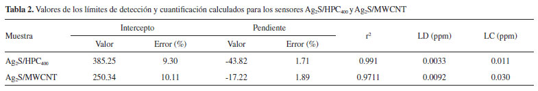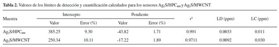 Según los resultados obtenidos el sensor Ag2S/HPC400 presenta linealidad en el rango de concentraciones de 1×10-7 - 1×10-3 mol L-1 [CN-], se obtuvo una ecuación de la recta: E (mV) = 385.24 – 43.82 log [CN-], con un r2 = 0.991. En el caso del sensor Ag2S/MWCNT se obtuvo una ecuación E (mV) = 250.34 – 17.002 log [CN-] en el rango lineal entre 1×10-7 - 1×10-5 mol L-1 [CN-], con un r2 = 0.9711. Se calculó el límite de detección (LD) y el límite de cuantificación (LC) del sensor Ag2S/HPC400, en un rango de concentraciones de 1×10-7 - 1×10-3 mol L-1 [CN-], mediante el método recomendado por la IUPAC.26 Además, se realizaron cálculos estadísticos con el cual se obtuvo la validez del modelo de la regresión lineal del sensor, estos resultados se indican en la Tabla 2. Se obtuvo un límite de detección para el sensor Ag2S/HPC400 de 3.3±0.2 µg L-1 y un límite de cuantificación de 11.0±0.5 µg L-1; mientras que para el sensor Ag2S/MWCNT se obtuvo un valor de LD y LC de 9.2±1.9 µg L-1 y 30.4±3.0 µg L-1, comparativamente más altos que los obtenidos con el sensor Ag2S/HPC400. Se concluye que el sensor Ag2S/HPC400 presenta una mayor sensibilidad que el sensor Ag2S/MWCNT.