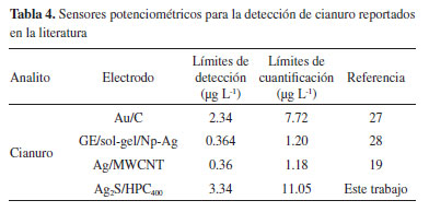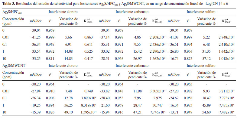 En la Tabla 3 se presenta los valores de los coeficientes de selectividad. El sensor Ag2S/HPC400 presenta coeficientes de selectividad menores que uno para los tres interferentes en un rango de concentración de 0.01 - 10 ppm. Para el caso del sensor Ag2S/MWCNT se encontró que solo es selectivo a bajas concentraciones de los tres interferentes (0.01 ppm). En la Tabla 4 se compara al electrodo Ag2S/HPC400 con otros sensores para la detección de cianuro libre, los límites de detección y de cuantificación obtenidos son mas bajos19,27,28 que los obtenidos en este trabajo; sin embargo, están dentro de los límites establecidos por los estándares de calidad ambiental en Perú de 22 µg L-1.1