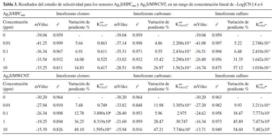 Prueba de selectividad La evaluación de la selectividad se realizó empleando los siguientes iones interferentes: Cl–, CO32– y S2–, se realizó el método de relación de interferente, se calculó ![]() donde Si Si Las pruebas de selectividad para ambos sensores desarrollados se realizaron en un rango de concentración de 0.01 – 10 ppm del ion interferente (Cl–, CO32– y S2–). En la Figura 7 se puede observar la disminución de la sensibilidad de ambos sensores, Ag2S/HPC400 y Ag2S/MWCNT, y la disminución de su rango lineal de 1×10-7 -1×10-3 mol L-1 [CN-] a 1×10-6 - 1×10-4 mol L-1 [CN-] en relación al incremento de la concentración de los diferentes interferentes; en la Tabla 3 se indican los resultados obtenidos para cada sensor.