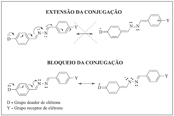 Tratando-se de uma cadeia linear com ligaçoes duplas conjugadas, esperava-se que azinas acíclicas diarílicas, adequadamente substituídas, apresentassem um sistema estendido de deslocalizaçao eletrônica. Contudo, estudos eletroquímicos9 e de Ressonância Magnética Nuclear (RMN)10 mostraram que este grupo funciona como um bloqueador de conjugaçao (Figura 2). Assim, as duas iminas (C=N) unidas pela ligaçao N–N, que constituem a funçao azina, podem ser consideradas grupos receptores de elétrons orientados em direçoes opostas, conforme descrito na Figura 2. Quando ligadas a dois anéis arílicos substituídos adequadamente, com grupos doadores ou receptores de elétrons, as azinas sao capazes de gerar um momento de dipolo na estrutura química na molécula, o que as tornam candidatas apropriadas para o desenvolvimento de materiais ópticos nao lineares.11