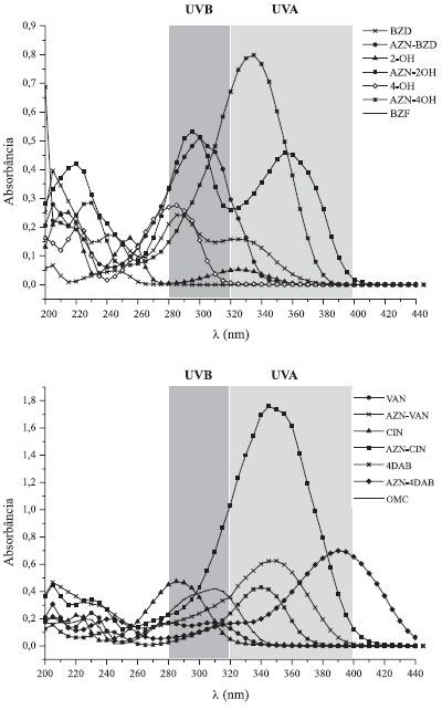 ![]() Figura 4. Espectros de absorçao molecular UV/Vis das formulaçoes contendo os aldeídos precursores, as azinas sintetizadas e os filtros comerciais na concentraçao de 2,5 x 10-5 mol L-1 empregando-se etanol 96 ºGL