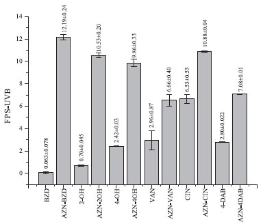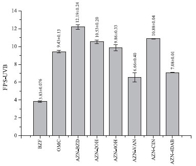 As formulaçoes BZF e OMC apresentam bandas de máxima absorçao (λmax) nos comprimentos de onda de 280 e 325 nm, para a primeira, e 230 e 310 nm para a segunda, corroborando com a literatura.33,34 A AZN-BZD e a AZN-4OH absorveram principalmente na regiao UVB, com λmax em 300 e 280 nm, respectivamente, enquanto que aAZN-VAN, a AZN-CIN e a AZN-4DAB absorveram principalmente na regiao UVA, com λmax em 335, 345 e 390 nm, respectivamente. A AZN-2OH, apresentou capacidade de absorçao significativa tanto na regiao UVB (λmax 295 nm) quanto na UVA (λmax 355 nm). O FPS-UVB das formulaçoes foi determinado pelo método in vitro desenvolvido por Mansur e colaboradores.28 Santos e colaboradores compararam o FPS de formulaçoes contendo OMC empregando o método desenvolvido por Mansur e o método in vivo preconizado pelo Food and Drug Administration (FDA), e concluíram que há uma boa relaçao entre os resultados obtidos pelos dois métodos.35 Ademais, considerando que o método in vivo de avaliaçao do FPS-UVB é realizado em seres humanos, iniciar os estudos usando previamente um método in vitro para testar a capacidade fotoprotetora de novos filtros químicos é um protocolo que deve ser estimulado. Com a finalidade de se determinar os valores de FPS-UVB das formulaçoes preparadas, foram realizadas as leituras em triplicata, no espectrofotômetro UV/Vis na regiao de 290-320 nm, e os FPS-UVB calculados de acordo com a Equaçao 1. Os resultados obtidos estao expressos na Figura 5, com valores de FPS ± Desvio Padrao (DP).