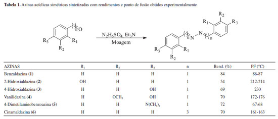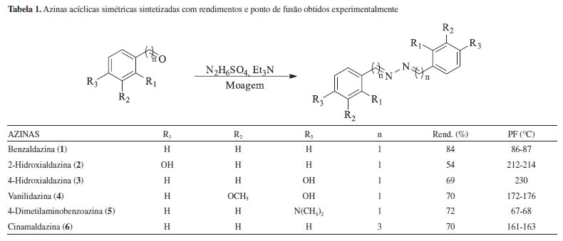 RESULTADOS E DISCUSSAO Síntese das azinas simétricas por moagem manual e caracterizaçao estrutural Empregando energia mecânica, através de moagem manual, seis azinas simétricas foram sintetizadas na ausência de solventes a partir de aldeídos aromáticos e sulfato de hidrazina, empregando trietilamina como catalisador. Os rendimentos das reaçoes foram satisfatórios (54-84%), e a água e o etanol, solventes verdes, foram usados na precipitaçao e purificaçao dos produtos, Tabela 1.