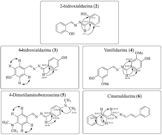Figura 3. Representaçao das principais correlaçoes que confirmaram a estrutura molecular das azinas sintetizadas (2-6). As setas simples representam o acoplamento 1H,13C a 2,3JC-H e as setas duplas representam o acoplamento entre os hidrogênios vicinais