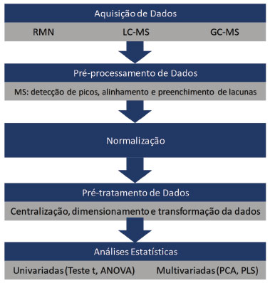 O futuro da metabolômica microbiana certamente está relacionado com os avanços em técnicas analíticas que permitam a utilizaçao de amostras de biomassa muito pequenas. Nesse sentido, a espectrometria de massas parece ser a tecnologia com o melhor potencial para alcançar esses objetivos.22 Mediante os trabalhos avaliados, é possível observar que a utilizaçao de múltiplas plataformas é extremamente interessante nos estudos metabolômicos, possibilitando uma ampla faixa de investigaçao, levando a resultados confiáveis e com uma grande quantidade de informaçao. Processamento e análise de dados Os dados gerados a partir das análises metabolômicas sao abundantes e de alta complexidade e, por isso, ferramentas adequadas ao tratamento de dados devem ser empregadas a fim de evitar erros de interpretaçao dos resultados e manter a integridade das variaçoes biológicas inspecionadas.15 Assim, um dos maiores desafios da metabolômica envolve o pré-processamento e a análise de dados, sendo necessárias amplas opçoes de softwares e estratégias para transformar dados brutos em resultados biológicos úteis.122 As ferramentas necessárias nesse processamento incluem estratégias para processar arquivos tanto de GC-MS e LC-MS quanto de NMR, onde uma série de ferramentas de análise estatística, bancos de dados de metabólitos e, finalmente, softwares de bioinformática sao utilizados.15 Pré-processamento O pré-processamento de dados é um passo intermediário entre a aquisiçao direta e a análise dos dados.5 A maioria dos softwares de pré-processamento compartilham as funçoes gerais de deconvoluçao de sinais analíticos, filtragem de ruído, detecçao e alinhamento de picos cromatográficos, correçao da linha de base e preenchimento de lacunas (gap filling), embora as capacidades, vantagens e limitaçoes variem drasticamente dentre a grande possibilidade de softwares atualmente disponível.15,122,123 As etapas gerais de processamento podem ser resumidas na Figura 3, onde as principais etapas sao descritas, podendo haver variaçoes mediante à aplicaçao empregada e ao objetivo da análise.