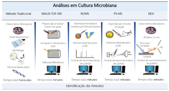 Figura 2. Fluxos de trabalho para identificaçao microbiana. Método tradicional; Ionizaçao e dessorçao a laser assistido por matriz (MALDI) espectrometria de massas (MS) por tempo de voo (TOF); Espectrometria de massas com ionizaçao evaporativa rápida (REIMS); Espectrometria de massas por pulverizaçao em papel (PS-MS); Ionizaçao de Dessorçao por Electrospray (DESI). Extraído de Luzzatto-Knaan et al. 2015.121 Copyright 2015, com autorizaçao da revista Analyst