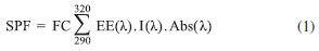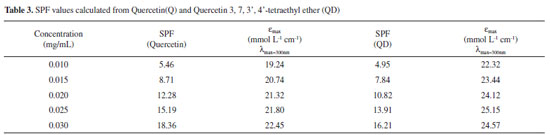 Quercetin 3,7,3',4'-tetraethyl ether is a known compound and comparison of its melting point and spectroscopic data (NMR and FT-IR) with literature26,27 values confirmed the formation of product. The spectrum in the infrared region showed absorption bands characteristic of the product. The absorption band in 3400 cm-1 indicated the presence of a hydroxyl, which did not undergo alkylation reaction with iodoethane, due to intramolecular hydrogen bonding with the ketone group present in the structure. IR bands ~3000 cm-1, 1650, 1500 e 1450 cm-1, which are, respectively, the CH band of aromatics and C = C of aromatics. The NMR spectra (1H and of 13C) showed resonance signals corresponding to the ethoxy substituents (OCH2CH3) formed by alkylation of the phenolic hydroxyls. The presence of a triplet integrating for eight hydrogens with chemical shift equal to 4.10ppm and a singlet in the 13C spectrum with chemical shift of 64.4 ppm was indicative of methylene group and a quartet integrating 12 hydrogens at 1.34 ppm with its corresponding singlet in the 13C spectrum at 14.8 ppm confirmed the presence of methyl group.28 In order to improve the liphophilicity of Quercetin, alkylation of the free hydroxyl groups with an iodoalkane was envisaged to improve the chemical properties so that the modified compound would more efficiently absorbed by the skin. The log P of Quercetin 3,7,3',4'-tetraethyl ether is 4.61 and Quercetin is 1.68. Log P> 1 the molecule has a lipophilic character and Log P < 1 the molecule has a hydrophilic character. The log P octanol-water partition coefficient was calculated using Molinspiration Interactive log P calculator.29 Solar Protection Factor The SPF was evaluated using the Mansur method.20 The analysis was carried out on an ultraviolet spectrophotometer, where the values of the obtained absorbances were placed in equation 1, and generated SPF values as presented in the Table 3. Ethylhexylmethoxy cinnamate (octinoxate) and 2-hydroxy-4-methoxylbenzophenone (oxybenzone) have been used as positive controls in previous studies. Octinoxate at a concentration of 0.010 mg mL-1 presented an SPF of 9.36 and the SPF of Oxybenzone at a concentration of 0.023mg mL-1 was reported to be 6.90.27 By analysis of the obtained data, we verified that the Quercetin and Quercetin 3, 7, 3', 4'-tetraethyl ether (QD) presented SPF proportional to the analyzed concentrations, that is, the higher non-toxic concentration (according to the cell viability test) the higher the Sun Protection Factor. Although chemical modification of Quercetin slightly lowered its SPF, the results are never the less promising and given the potential for improved skin absorption, the derivative compound would be more effective in acting as a UV filter.