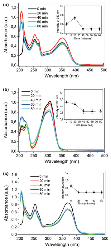 ![]() Figure 2. Graphs of photostability of Quercetin 3,7,3',4'-tetraethyl ether (a), standard Ethylhexylmethoxycinnamate (b) and Quercetin (c), in methanol and room temperature. The photostability of the compounds before and after exposure to UVB radiation are shown in the insert