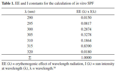 EXPERIMENTAL General considerations Reagents and solvents were purchased from Sigma Aldrich and used without further purification. The melting points were measured on the Büchi Melting Point B-540. NMR data were obtained with 200 MHz NMR instrument. Chemical shifts are reported in d (ppm) with reference to residual protons and 13C signals in deuterated solvent (CDCl3) The UV-vis absorption measurements were performed with a Bel Engineering UV-M51 Spectrophotometer. The MTT (3-[4,5-dimethyl-thiazol-2-yl]-2,5-diphenyl tetrazolium bromide) cytotoxicity assay was performed using Hep G2 cells. A mechanical stirrer used for the production of the nanoemulsion was Fisatom® Mod.713. The granulometry of the nanoemulsion was determined by Photon Correlation Spectroscopy on the Malvern Zetasizer model ZS. For the development of nanoemulsions were used: a) Sunflower oil (Liza) - food oil; b) Croduret 50 - Special® (Croda) - hydrogenated and ethoxylated castor oil, surfactant with HLB of 14.1; designated by the CTFA as PEG-40 Hydrogenated Castor Oil; c) Crill 3 - (Croda) - Sorbitan monostearate, surfactant with EHL of 4.7; named by CTFA Sorbitan stearate (C24H46O6); d) Newly obtained distilled waterand e) Substance of interest (Quercetin and/or derivative and EthylhexylMethoxycinnamate). Synthesis of quercetin 3,7,3',4'-tetraethyl ether 0.755 g (2.49 mmol) of Quercetin, 7.5 mL of DMF, 1.552 g (11.23 mmol) of potassium carbonate and 1mL (12.50 mmol) of iodoethane were added to a 50 mL round bottomed flask. Stirring was allowed for two days at room temperature. The reaction solution was diluted with 30 mL of dichloromethane and 20 mL of HCl (0.1 mol L-1) and the resulting organic phase was separated and washed three times with 20 mL of water. Anhydrous sodium sulfate was added to dry the solution and the organic solvent was concentrated on rotary evaporator. Thin layer chromatography (TLC) of the crude product was carried out using 2:8 ethyl acetate/hexane as the eluent and the product presented an Rf equal to 0.72 compared which was greater than the Rf of the staring material Quercetin. Next, the product was purified by flash column chromatography employing silica gel and ethyl acetate/hexane 2:8. The product was obtained in 0.150 g (14% yield) as a yellow solid with a melting point in the range of 119-120 ºC (lit = 116-120 ºC)20 and Octanol-Water partition coefficient (miLogP) of 4.61; IR (KBr) n (cm-1): 2500-3500 (intense and wide band of OH associated), 3030 (C-H of aromatics), 1,600, 1,580, 1,500 and 1,450 (C=C of aromatics).RMN1H (200MHz, DMSO-d6, ppm): 1.34 - 153 (m, 12H); 4.14 (q, J = 6.6, 4H); 4.23 (q, J = 6.6, 4H); 6,34 (s, 1H); 6.43 (s, 1H); 6.97 (d, J = 9.3 1H); 7.72 (d, J = 9.3, 1H) e 7.76 (s, 1H); 13CNMR (50 MHz, DMSO-d6, ppm): 14.8; 15.6; 64.1; 64.4; 64.8; 68.5; 92.5; 98.1; 109.5; 112.4; 113.8; 122.1; 123.2; 137.9; 148.2; 151.2; 156.1; 156.7; 162.0; 164.7; 178.8. In vitro determination of the Sun Protection Factor (SPF) The in vitro Solar Protection Factor (SPF) was determined by the spectrophotometric method developed by Mansur,20 using Eq. (1). ![]() where: FC = 10 (constant), EE = erythemogenic effect, I = Intensity of the sun and Abs= absorbance of the sample. Absorption readings were performed in the range of 290 to 320 nm with intervals of 5 nm and added in equation 1. The constants EE and I were pre-defined by Mansur,20 according to Table 1.