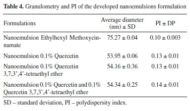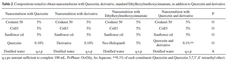 Log P- octanol-water partition coefficient21 The log P octanol-water partition coefficient was calculated using the online Molinspiration program Interactive log P calculator (software version v2015.01). Evaluation of photostability The photostability test was performed using a light chamber with a UVB lamp source. Solutions of 0.010 µg mL-1 Quercetin, derivative and a reference standard (Ethylhexylmethoxycinnamate) were prepared in methanol. The solutions were placed in volumetric flasks without a cap and exposed to radiation for total time of 2 h and evaluated at 20-minute intervals upon exposure to UV radiation. The system were open during the irradiation. Preparation of nanoemulsions The nanoemulsions were prepared according to the Emulsion Phase Inversion (EPI) method,22 However, to obtain the formulations, the distilled water and the oil phase were heated separately at 75±2 ºC. The water was slowly poured under the oil phase and the system was maintained under constant stirring at a speed of 520 rpm. Stirring was continued until the temperature was reached at 25±2 º C. After 24 h, all formulations were macroscopically evaluated. The compositions tested for nanoemulsions were the ones according to Table 2.