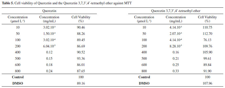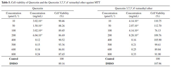 The size of the globules of an emulsion depends on the emulsification method employed. The results demonstrate the efficiency of the phase inversion emulsification method in obtaining nanoemulsions, since the presented deviations are small, characterizing a good homogeneity of the granulometric size of the nanoemulsions particles. In addition, the small particle size allows them to deposit evenly on the surface of the skin, creating a continuous film and consequently increasing the effectiveness of the nanoemulsion in protection against UVA and UVB rays. This type of formulation also protects photosensitive compounds, which is of great interest in cases where the asset degrades during exposure to visible or UV light.34-37 Formulations were also evaluated for the addiction of different concentration of Quercetin, (5, 1, 0.2 and 0.1%). A precipitate formation could be observed for the three highest concentrations tested, showing the instability of these formulations and the difficulty of solubilizing quercetin even in an oily vehicle. Thus, as previously mentioned, a nanoemulsion with 0.1% Quercetin was prepared, in which there was no precipitate formation after 24 h from the preparation time. This concentration was also used for the Quercetin 3,7,3',4'-tetraethyl ether. As it is more hydrophobic than Quercetin, it could be better solubilized within the oily phase, showing no sign of instability or precipitation. It was noticed the reduction of particle size of nanoemulsions with both additives without compromising system stability. Cell viability According to ISO2009 - 10993-5, a substance is considered cytotoxic when the cell viability is less than or equal to 70%. Therefore, the results obtained in the MTT test were compared according to the ISO. The MTT assay provided the data related to Quercetin and Quercetin 3,7,3',4'-tetraethyl ether according to Table 5. Based on the results obtained, it is observed that Quercetin and the derivative are non-toxic in the concentration range of 1 to 800 µmol L-1, since the cell viability was higher than 86.69% for Quercetin and 89.84% for Quercetin 3,7,3',4'-tetraethyl ether.