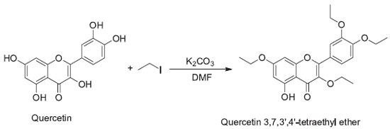 RESULTS AND DISCUSSION Synthesis of quercetin 3,7,3',4'-tetraethyl ether (derivative of quercetin) The reaction of the Quercetin with iodoethane occurred in the presence of inorganic base potassium carbonate and solvent dimethylformamide resulting in the formation of Quercetin derivative Quercetin 3,7,3',4'-tetraethyl ether. The phenolic hydroxyls present in Quercetin were alkylated according to Figure 1.