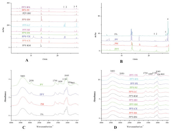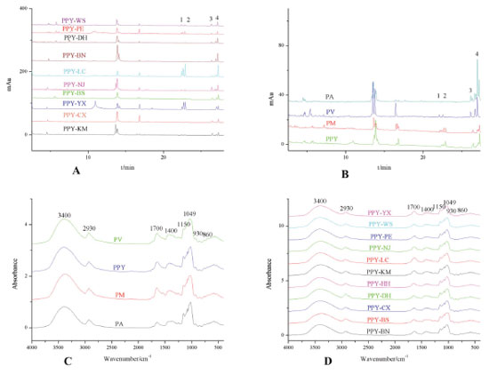 Figure 4. Typical chromatography for Paris in different species (A) and geographical origins (B); FT-IR spectra of sample in different species (C) and geographical origins (D). "1, 2, 3 and 4" were responsible for the PSVII, PSVI, PSII and PSI, respectively