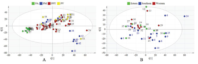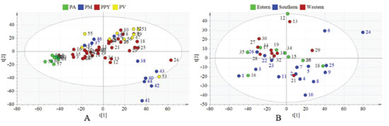 Figure 6. Two-dimension score plot of PLS-DA based on FT-IR spectroscopy for PPY, PM, PV and PA (A); Two-dimension score plot of PLS-DA for different geographical origins (B)