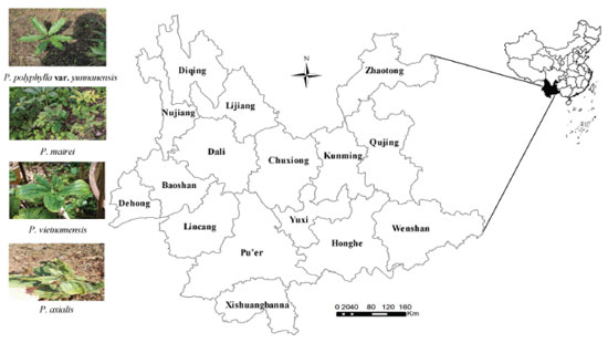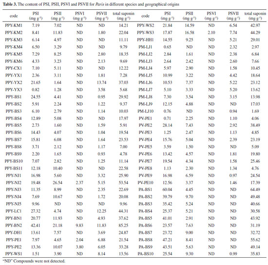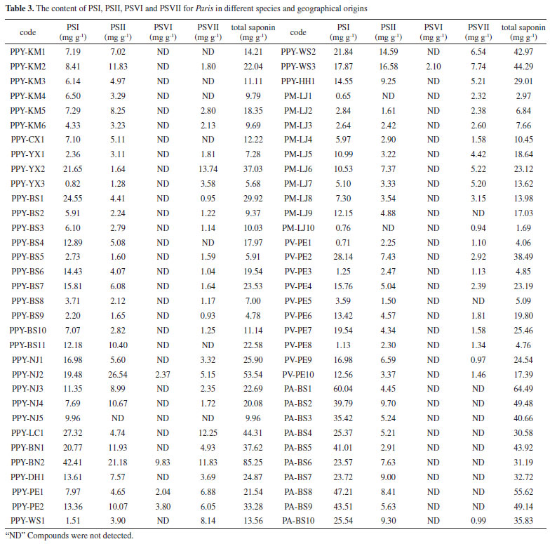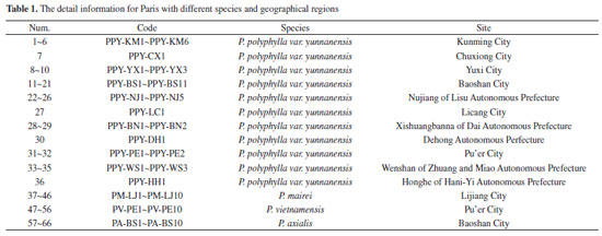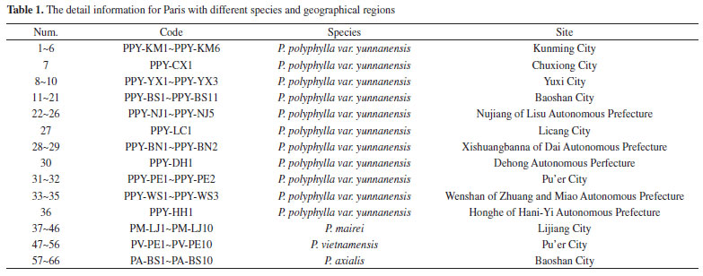 MATERIALS AND METHODS Chemicals and reagents Standard compounds of PSI, PSII, PSVI and PSVII were purchased from Chengdu Must Biotechnology Co., Ltd. (Chengdu, China). The purity (> 98%) of all reference compounds were tested by UHPLC-UV. Acetonitrile and formic acid of HPLC-grade were purchased from Dikmapure Co., Ltd. (Lake Forest, MA, USA). Distilled water was prepared by Milli-Q water purification system (Bedford, MA, USA). Analytical-grade methanol was provided by Kemiou Chemical Reagent Co., Ltd. (Tianjin, China). Potassium bromide of spectroscopic grade was purchased from Fengchuan Fine Chemical Research Institute (Tianjin, China). Plant materials Sixty-six batches of fresh wild Paris spp. were collected in the Yunnan Province of China. Four species including PPY, PM, PV and PA were collected from Kunming, Yuxi, Wenshan, Baoshan, Chuxiong, Dehong, Honghe, Lincang, Nujiang, Xishuangbanna, Pu'er and Lijiang, and all of them were authenticated by Professor Hang Jin (Yunnan Academy of Agricultural Sciences). The detailed information is listed in Table 1. Voucher specimens were deposited at the Institute of Medicinal Plants, Yunnan Academy of Agricultural Sciences (Kunming, China). Each plant sample was washed and dried at 60 ºC in the oven. The processed rhizome was pulverized and the obtained powder were passed through a 60 mesh sieve. Then, the powdered materials were stored in valve plastic bags until further analysis.