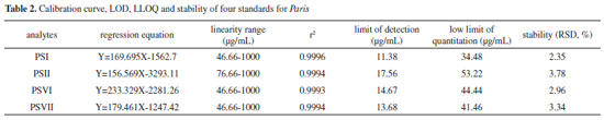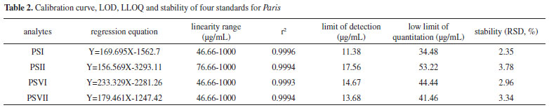 RESULTS AND DISCUSSION Method validation The linearity of calibration curve, limit of determination (LOD), low limit of quantification (LLOQ), intra- and inter-day precision, accuracy and stability were all determined in order to investigate each compound in Paris spp. The method validation was carried out by four standard constituents in agreement with the Guidance for industry: Bioanalytical Method Validation, as specified by the FDA.19 The calibration curves were established with the stock solution of standards in methanol, being diluted with the same solvent into six appropriate concentrations. Different concentrations, from low to high, were injected into the UHPLC-UV system. The linear regression equation was obtained by plotting the peak area Y against the concentration X (µg mL-1). LOD and LLOQ were calculated by signal-to-noise ratio of 3 and 10, respectively. The results are listed in Table 2. All the calibration curves showed good linearity (R2 > 0.9993). LOD ranged from 11.38 to 17.56 µg mL-1, and LLOQ from 34.48 to 53.22 µg mL-1. Stability of sample solution was calculated by peak areas of analytes after storing at room temperature for 0, 2, 4, 12 and 24 h. The results indicated that all analytes were stable within 24 h (RSD < 3.78%).