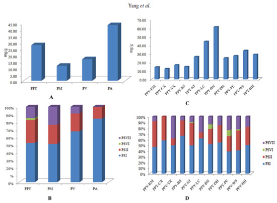 For intra- and inter-day precision, three different concentrations levels (low, medium and high quality control) of five replicates each day for three consecutive days were performed experimentally. As shown in Table 1S, RSD of intra- and inter-day variations were ≤ 3.22% and 3.76%, respectively. For accuracy of the method, the recovery rate was calculated by the sample being spiked with three different concentrations (50%, 100% and 150% of the known amount in sample). The formula [Recover rate = (detected amount - original amount) / added amount] was carried out. The results are listed in Table 2S. The range of recovery rate was from 97.17% to 101.00%, and the RSD was less than 2.79%. Targeted quantification for quality evaluation Four reference standards were identified using retention time, structure and analysis of the literature data. Diosgenin-type and pennogenin-type saponins, as the main structures, were found in Paris. Rhamnose, arabinose and glucose were the major sugar moiety of saponins. Different features in the chemical structures could be responsible for different pharmacological effects. For instance, the structure of diosgenin-tereaglycoside (PSII) was different from pennogenin-type (PSVII) with the linkage of hydroxyl group at the C-17. Previous studies indicated that PSII was used for treatment as an immune-stimulating and haemostatic agent,20,21 while an antifungal property was tested for PSVII.22 In this study, the different content of these structures distributed in different species and geographical origins for Paris were investigated. Quantitative analysis for different species The validated UHPLC-UV method was applied for the simultaneous quantification of four steroids saponins in rhizome of different species of Paris. As shown in Table 3 and Figure 3(A), the average amount of total saponains including PSI, PSII, PSVI and PSVII of PA (43.36 mg g-1) collected in Baoshan City of the Yunnan Province was the highest in comparison with other species, and the lowest was PM (11.60 mg g-1) collected from Lijiang City. As an official medicinal material, the average content of total saponins for PPY could reach up to 22.72 mg g-1, which were 6 mg g-1 above the threshold value according to the Chinese Pharmacopeia (2015 edition). In addition, all employed species in this study were qualified as the current document for evaluation of Paris. Each individual had a significant variety of content in the same species. Taking PPY as an example: the highest total saponins in PPY-BN2 (85.25 mg g-1) collected from Xishuangbanna was 17.83 times higher than that in PPY-BS9 (4.78 mg g-1) collected from Baoshan. The total saponin in PM-LJ6 (23.12 mg g-1) was 13.68 times higher than that in PM-LJ10 (1.69 mg g-1) for the same species and geographical origins as well, which was markedly different. The results indicated that the secondary metabolites of the plant were correlated with genetic variations and growing conditions. The species and geographical regions, as in the previous study, had an influence on the accumulation of metabolites for Gentianaceae species.23 For each saponins, PSI had the highest content in most of the individuals, and PSVI was too low to be detected, except for PPY-NJ2 (Nujiang), PPY-BN2 (Xishuangbanna), PPY-PE1 and PPY-PE2 (Pu'er). In addition, the observed content of PSII was higher than that of PSVII. At last, it could be found that the content of diosgenin-type was higher than that of pennogenin-type. The content of each structure in different species was investigated, since there are various bioactive effects for each different structure. The results are listed in Table 3S and Figure 3(B). The percentage of each compound against the total content for four species was displayed. The data showed that PSI was the main metabolite in PA while PSII and PSVI were in PPY. The highest content ratio of PSVII was detected in PM. The highest percentage of diosgenin-type, including PSI and PSII, were found in PA. On the contrary, the percentage of pennogenin-type, including PSVI and PSVII, was the highest in PM.
