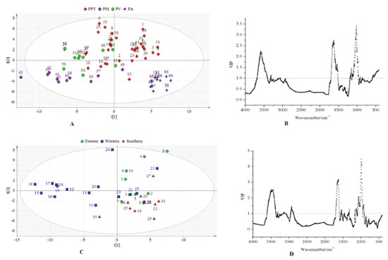 Figure 7. Two-dimension score plot of PLS-DA based on FT-IR spectroscopy for PPY, PM, PV and PA (A); VIP score plot for PPY, PM, PV and PA (B); Two-dimension score plot of PLS-DA for different geographical origins (C); VIP score plot for different geographical origins (D)