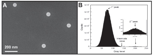 RESULTS AND DISCUSSION Electron microscopy images can be represented by a histogram, which is a plot of the number of pixels (y axis) with their respectively grayscale value (x axis). For example, supposing an 8 bit image, the abscissa displays the 256 levels of gray and the coordinate axis represents the levels of intensity (counts) of the image. Each peak in the histogram should correspond to one kind of structure in the image so it can be used to distinguish between the particles and the substrate. Several algorithms can be employed to locate, identify, and measure the particles on the substrate using the brightness histogram as part of the thresholding process. In this study, the intermodes algorithm developed by Prewitt and Mendelsohn was applied;5 it is based on images in which the object and the background pixels are separable. According to Fazeli et al.6 and Namgung et al.7, the extracted features correspond to the location of the peaks. Figure 1A shows a typical FE-SEM image of the polymer nanoparticles from the control sample, while Figure 1B presents two peaks in the histogram, the first of which represents the background (lower grayscale values), and the second of which represents the particles (higher grayscale values). In the intermodes algorithm,5 the threshold value is the mathematical mean between the first and second peaks of the histogram. Thus, this grayscale value is considered the limit between the particle and the substrate.
