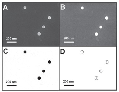 ![]() Figure 2. Example of image processing at the control sample. A) Original FE-SEM image, B) Image after brightness and contrast adjust, C) Image after the threshold process, and D) Outlines of nanoparticles