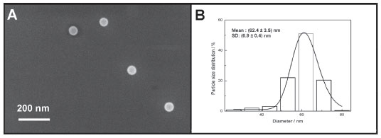 ![]() Figure 4. (A) FE-SEM image of near-spherical polymer nanoparticles without coating and (B) the respective histogram of particle size distribution