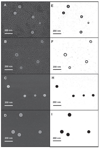 ![]() Figure 5. FE-SEM image of near-spherical polymer nanoparticles: A-B) coated with gold, 20 s and 50 s, respectively, C-D) After carbon deposition using 1 and 2 fibers, respectively. On the right column (E-I) is shown the result of applying the binary threshold process at images from the left column