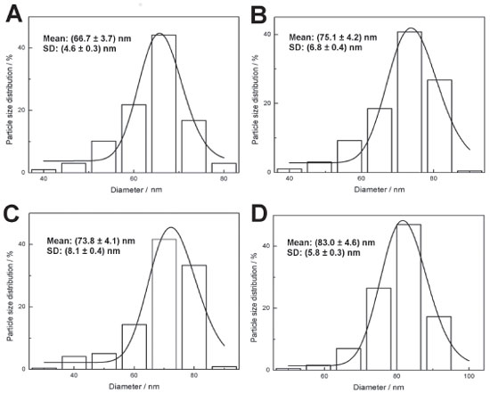 ![]() Figure 6. Histogram of particle size distribution and the fit curve related to the system: A) Au_20, B) Au_50, C) C_1 and D) C_2