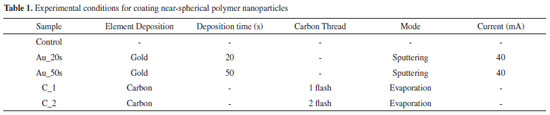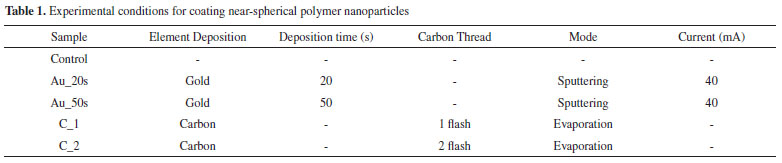 EXPERIMENTAL METHODS Sample Preparation NIST-traceable polymer nanospheres (Cat No 3060A) with particle diameters of 60 ± 2.7 nm were used in this study. Samples were prepared in an aqueous solution (0.0125% m/v) and dispersed using an ultrasonic bath (Ultrasonic Cleaner, model 1440D) for 3 min. Then, one drop of suspension was deposited on a conductive silicon substrate and dried for 48 hours in a desiccator containing silica spheres desiccant in a vacuum medium at room temperature. All of the samples were prepared in triplicate. Polymer is a known non-conductive material. We therefore prepared a control sample with no coating; we also studied the morphological characteristics of polymer spheres coated with a carbon or gold layer to avoid effects of a surface charge. Table 1 shows a detailed description of the samples' coating conditions and their labels. All of the parameters were chosen according to the criteria used to meet SEM sample preparation conditions in the Advanced Microscopy Laboratory (LMA) of the Chemistry Institute of Sao Paulo State University (UNESP) in Araraquara, Sao Paulo, Brazil.