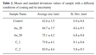 CONCLUSION The use of an automated method for determining particle size distribution was successful. The mean particle size values determined by electron microscopy agrees with the mean values for NIST-traceable polymer nanospheres, a result which reflects the validity of this method. Gold and carbon coatings were found to influence the shape and surface roughness of polymer nanoparticles. The coating process was found to minimize the effect of electric charges and to enhance brightness and contrast, but the process produces changes to particle size, shape, and surface texture. In this study, the thin layers of gold (deposited by sputtering) and of carbon (deposited by thermal evaporation) on near-spherical nanoparticles increased the diameter of the particles from 4.3 nm to 20.6 nm, depending on the deposition process. Gold deposition can produce thinner layers and significantly affect the particles' characteristics, generating gold islands on the surface. On the other hand, carbon deposition can produce a larger final average particle diameter than gold deposition can; it also produces a thick carbon coating that can alter the fine details on the particle's surface. Based on these results, it is recommended that non-conductive materials, such as pharmaceuticals, ceramics, and polymers, be tested to observe particles without surface coating using techniques provided by modern microscopes, such as gentle beam mode. When necessary, the deposition material chosen must be related to the sample analysis desired: if studying surface details is the main objective of the analysis, a carbon layer can be used, but if the average particle size is the most important parameter of analysis, the gold layer will have less of an influence.