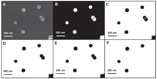 In some images in which the objects of interest did not share a single brightness or color value, such as Figure 3A, the threshold was applied to the background (the substrate) (Figure 3B), since the grayscale values that corresponded to the substrate on the histogram were more uniform than those of the objects. The resulting binary image (Figure 3B) was then inverted to produce the representation of the particles (Figure 3C). In images like Figure 3D, the binary algorithm (watershed segmentation) can be used to separate the particles, as described by Beucher8 and Sun et al.9 (Figure 3E). This option, however, is not recommended because the borders of each particle become unclear. The best decision is to erase agglomerated particles (bottom right in Figure 3F) or to select another image that has no agglomerated particles. Figure 3 exemplifies the image processing steps performed to identify and isolate particles using the above-mentioned tools. It is important to note that acquiring a good image during SEM analysis allows for a significant reduction in the time required for the image processing step.