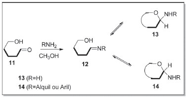Os ácidos nonulosamínicos (ácidos neuramínicos), por exemplo, sao derivados de 5-amino-5-desoxinonose encontrado usualmente na forma combinada no mucolipídeos ou mucopolissacarídeos em animais. Um exemplo é o ácido 5-acetamido-3-5-didesoxi-D-glicero-D-galacto-2-nonulosônico (ácido N-acetilneuramínico) 9 (Figura 2), conhecido como ácido siálico e encontrado em polissacarídeos de muitos animais e bactérias.36-42 O ácido 5-acetamido-3,5-didesoxi-D-glicero-D-galacto-2-nonulosônico foi sintetizado com 51% de rendimento a partir do ácido nonônico. Na literatura, há uma descriçao detalhada sobre o espectro de RMN 1H e de 13C do Neu5Ac em soluçao de óxido de deutério.43 A conformaçao do anel piranosídico de Neu5Ac, é do tipo 1C4, e a configuraçao β é estabilizada no grupo hidroxila da posiçao anomérica. Para caracterizaçao da estrutura do composto 9, foi realizada análise elementar, rotaçao específica, espectro de infravermelho e cristalografia de raios-X.43 Outros aminoaçúcares derivados têm mostrado interessantes propriedades farmacológicas, como por exemplo o composto 2,6-diamino-2,6-didesoxi-L-idose 10 (neosamina B) que é um constituinte do antibiótico paromomicina e neomicina B44 é um exemplo de aminoaçúcar com grupo amino na posiçao 6 (Figura 2). Carboidratos nos quais um grupo amino substitui o -OH anomérico sao chamados de glicosilaminas ou N-glicosídeos e podem ocorrer na forma de um anel de cinco ou seis membros e na configuraçao α- e β-anomérica (compostos 13 e 14). As aldoses sofrem reaçoes de condensaçao com amônia, aminas primárias ou secundárias para fornecer glicosilaminas. Um exemplo desse tipo de reaçao é a condensaçao da aldose 11 com amônia e aminas primária (Esquema 1),45 produz um aduto de imina instável 12, também chamado de base de Schiff, o qual é ciclizada para originaros α e β-anômeros 13 e 14. Uma análise mais recente dos mecanismos de reaçao da formaçao de glicosilamina identificou várias rotas para a formaçao de produtos.46